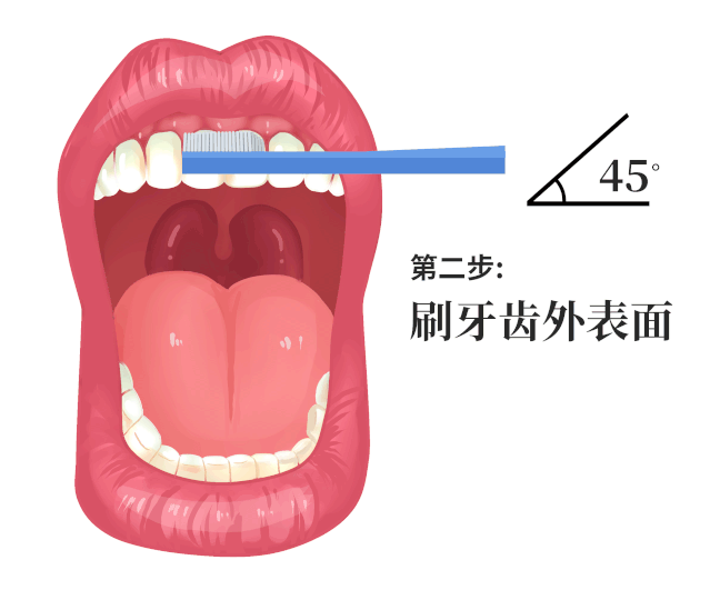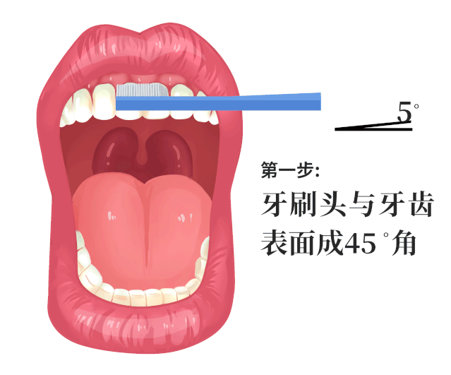 如下图所示,选择软毛牙刷,让牙刷头与牙齿表面成45°角,斜放并轻压在牙齿和牙龈交界处。
