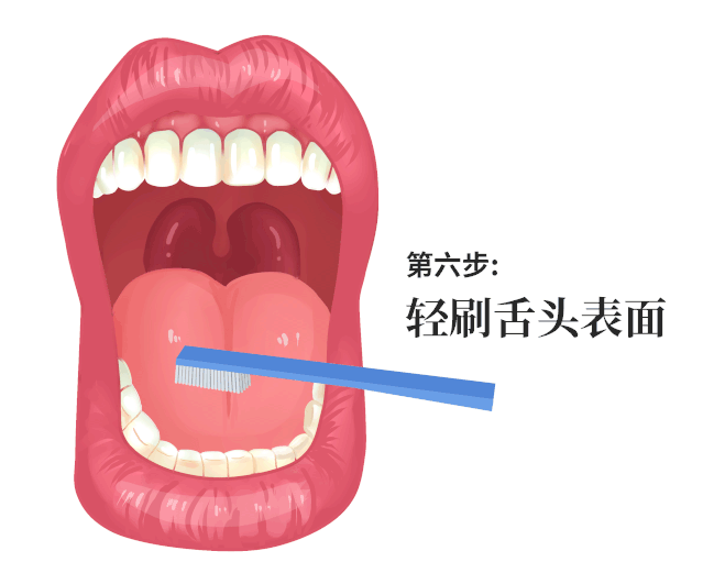 最后一步就是轻刷舌头表面了(很多人都会忽视),由内向外轻轻去除食物残渣及细菌,让您的口腔保持清新。