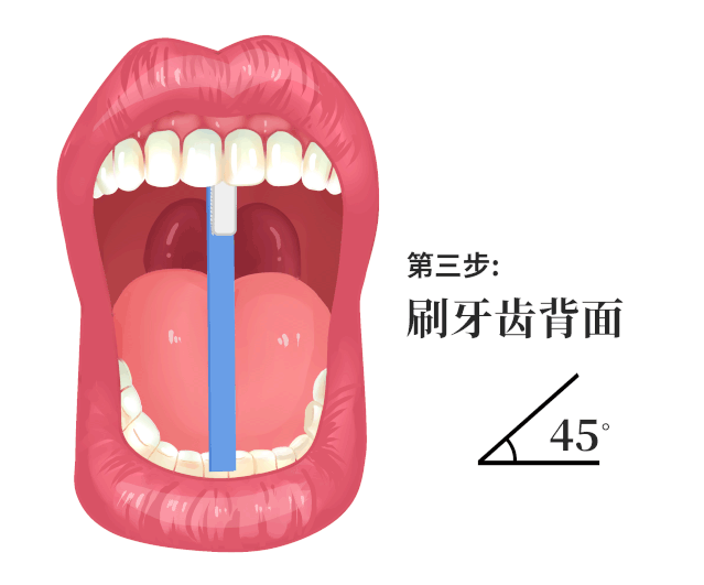 牙齿的内面最容易藏匿细菌,也最不容易刷到。将牙刷竖起,同样成45°角斜放,上排牙齿向下,下排牙齿向上提拉轻刷。